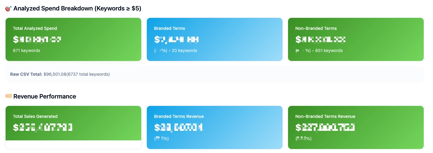 You can do this by going into your Campaign dashboard —> Click the “Export” button —> All keywords —> Last Touch Attribution. Upload the raw export to our brand vs non-brand analyzer tool