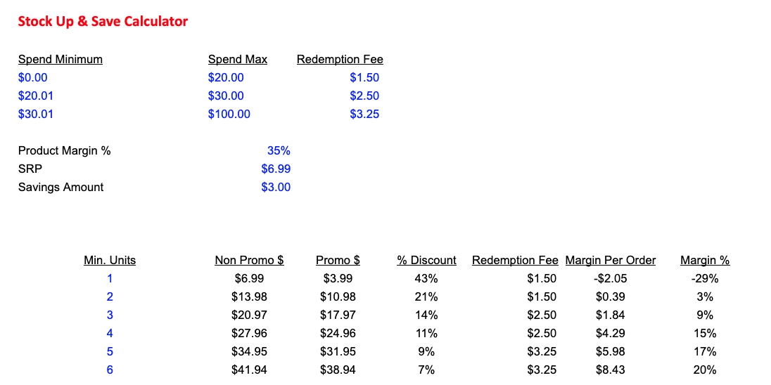 Build a simple margin model that includes the: i) redemption fee, ii) product margin %, iii) SRP (price), and iv) savings amount.